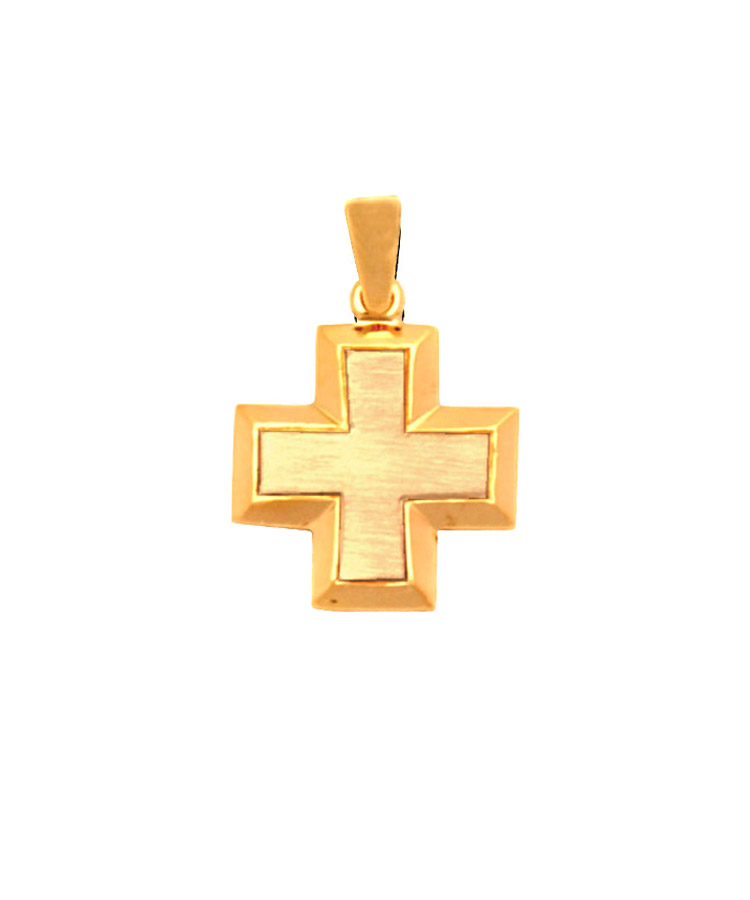 Gold raised design heavy cross in 14K yellow with satin finish center and high polished edges.