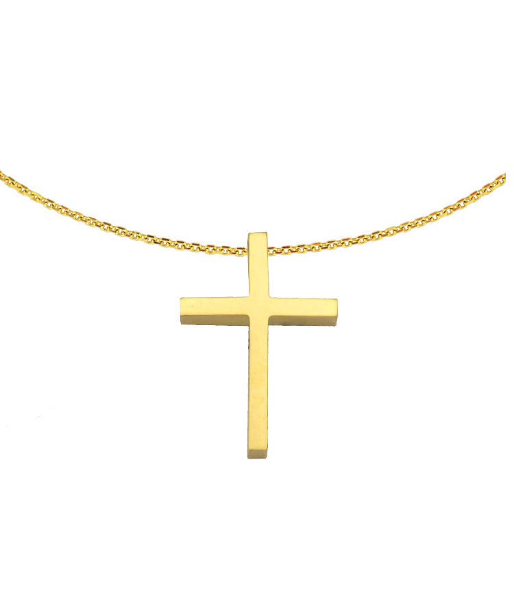 European gold cross thick pendant in 14K yellow or white, with a simple design and a high polish finish. It has a hidden bail for the appropriate chain or leather cord.