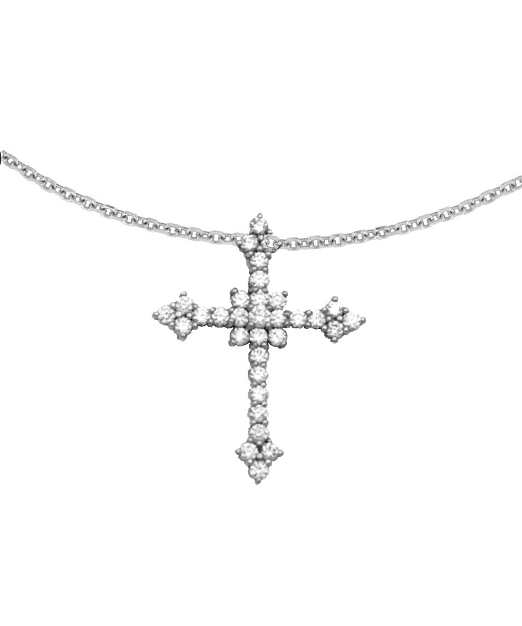Diamond radiant cross pendant in 14K White with 32 round prong set natural diamonds.
