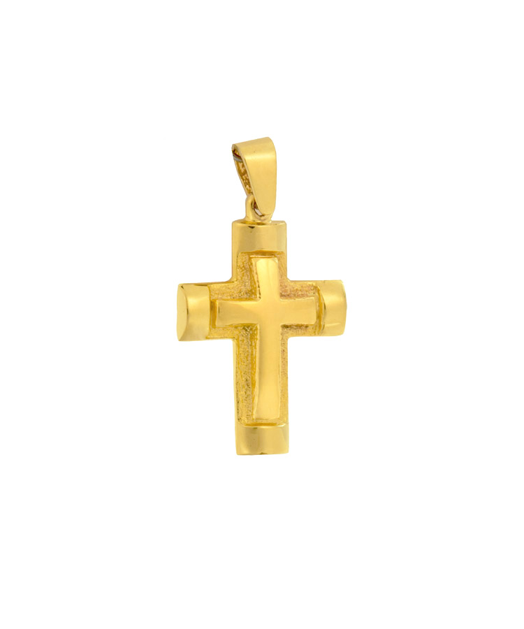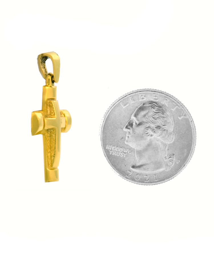 14K solid Yellow gold cross pendant with raised high polished detail and sandblasted finish.