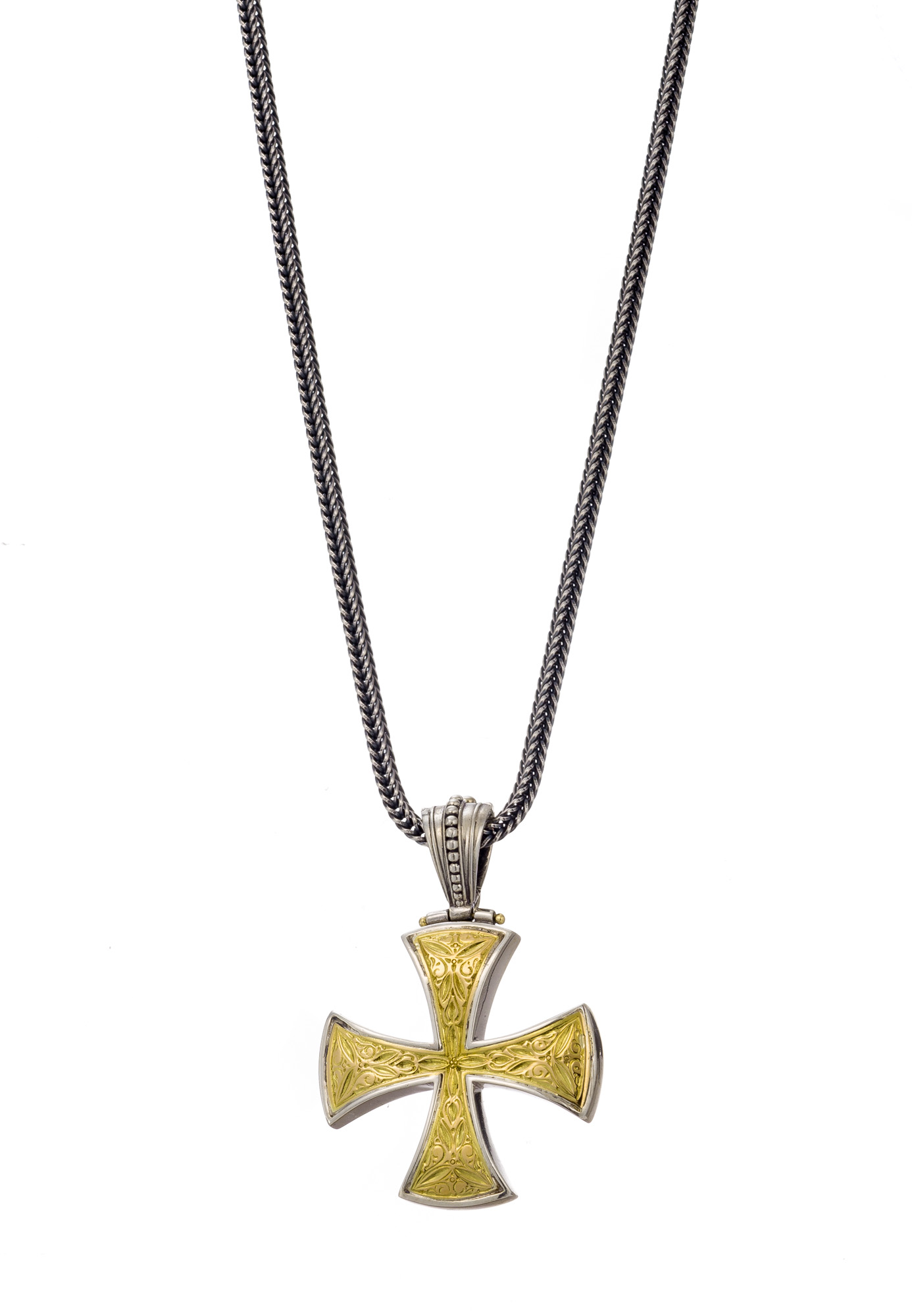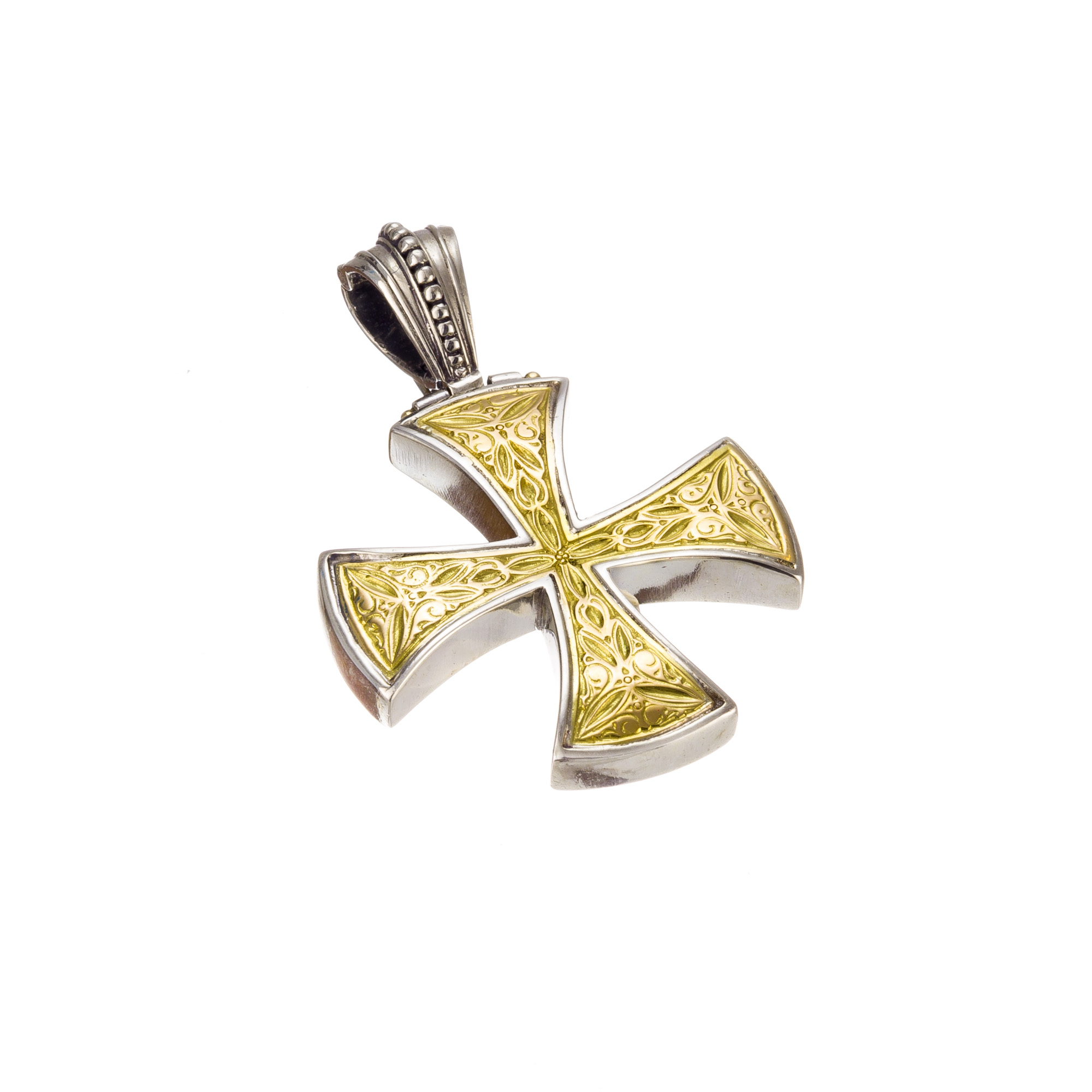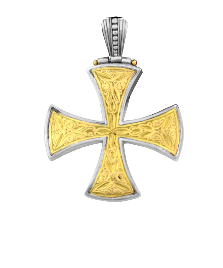 Maltese style cross with a lot of engraving and an 18K gold face