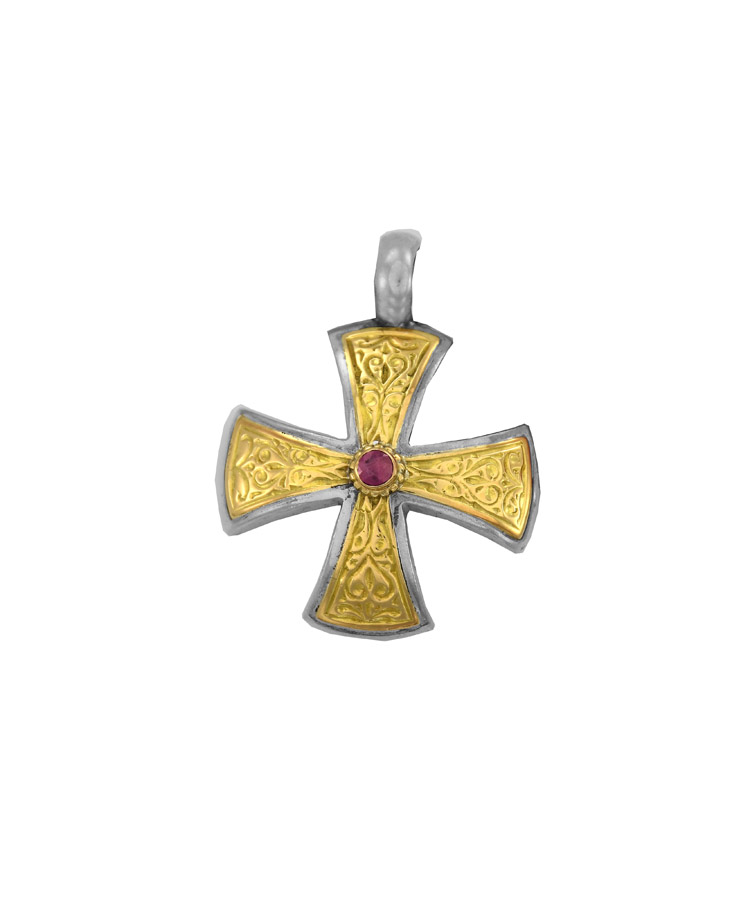 Maltese style cross with a lot of engraving and an 18K gold face with a round ruby in center