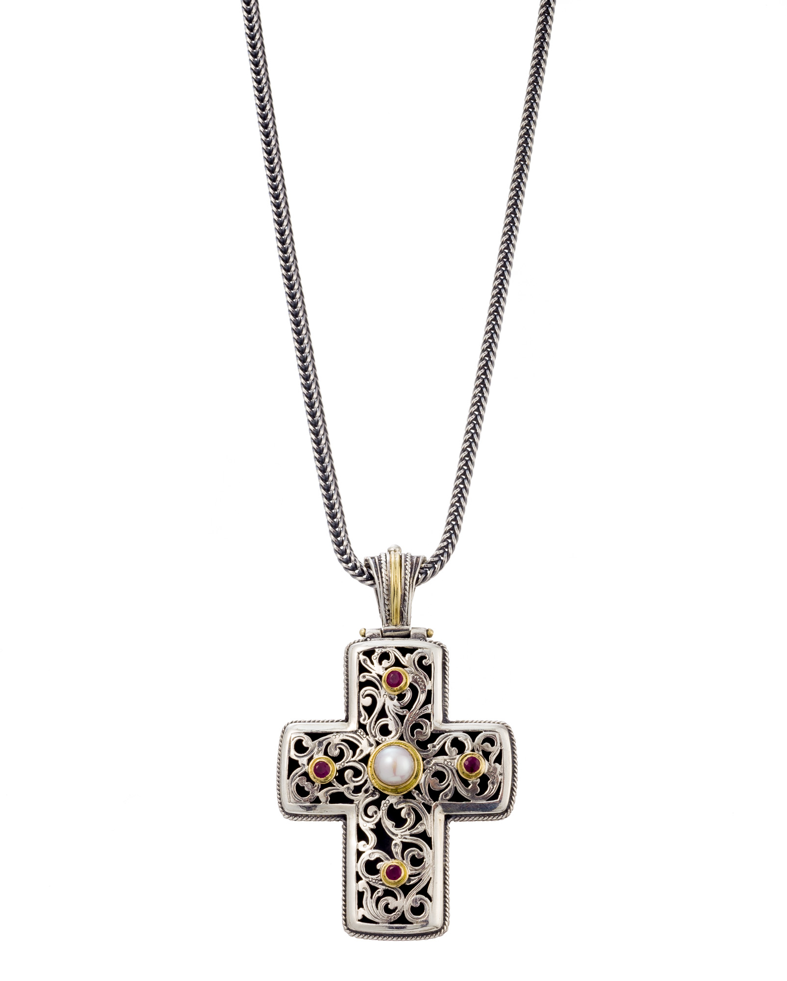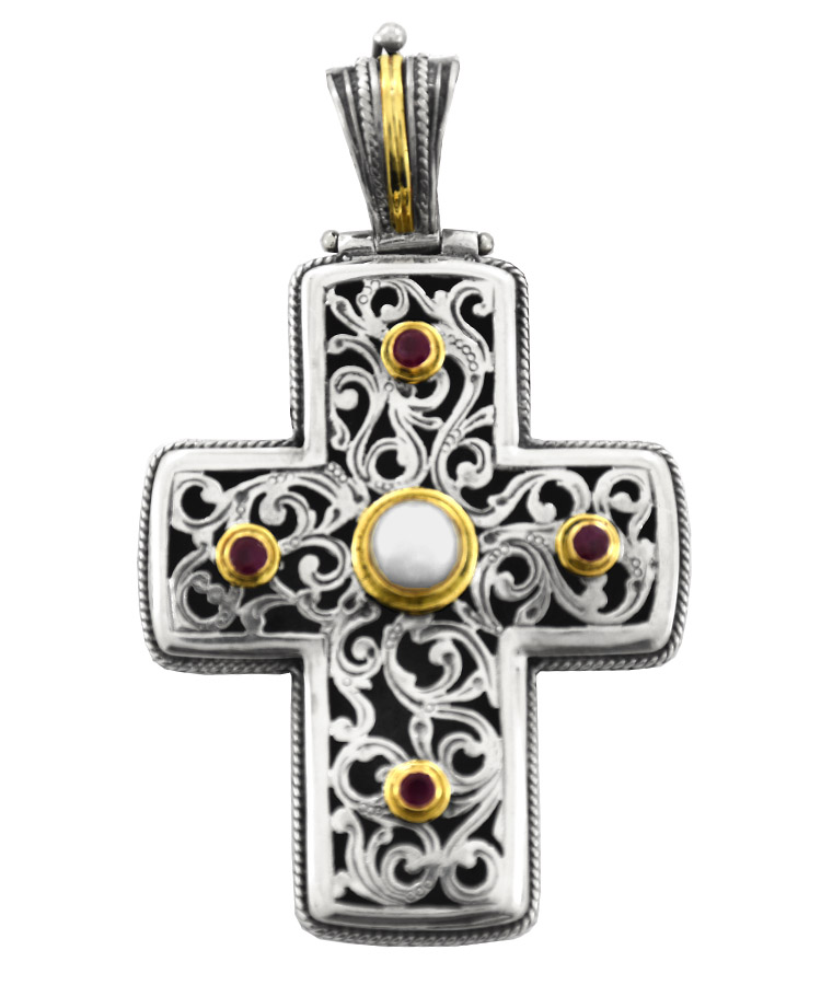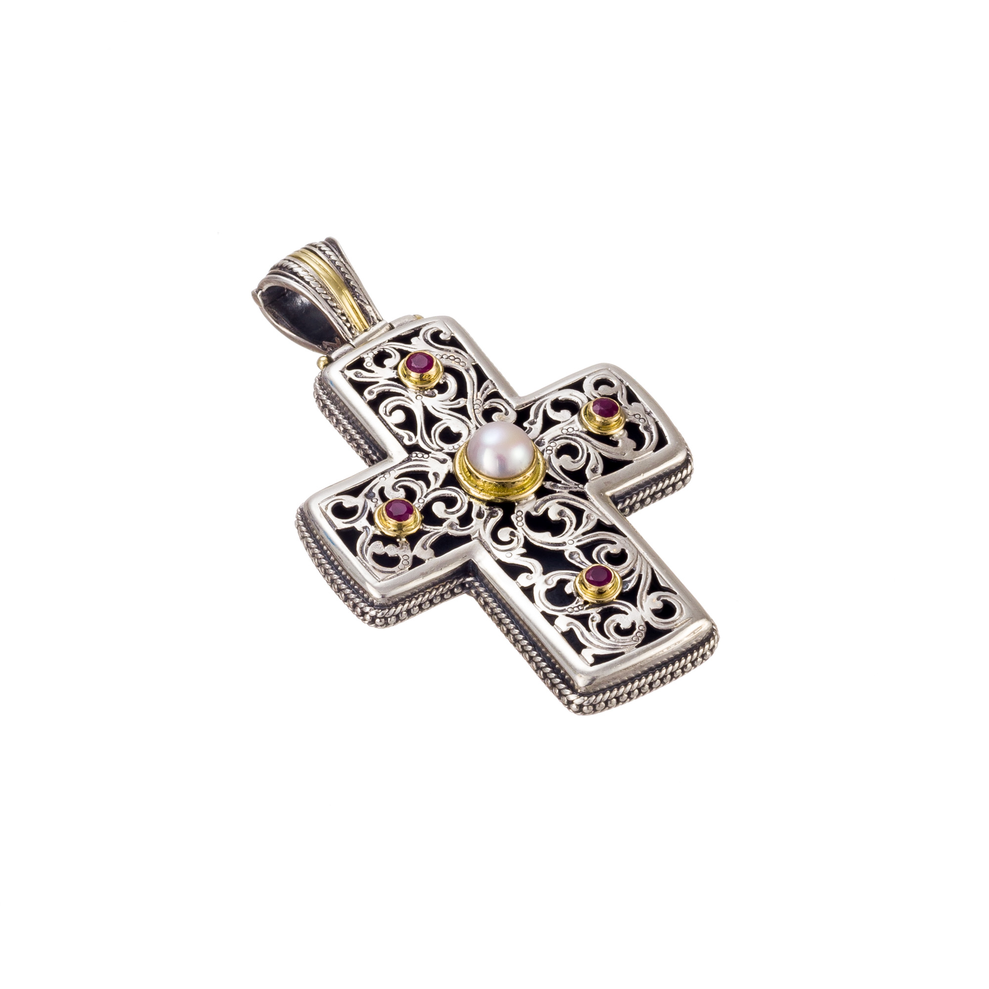 Sterling silver 925 and 18K gold European cross large pendant with rubies, handmade by Gerochristo