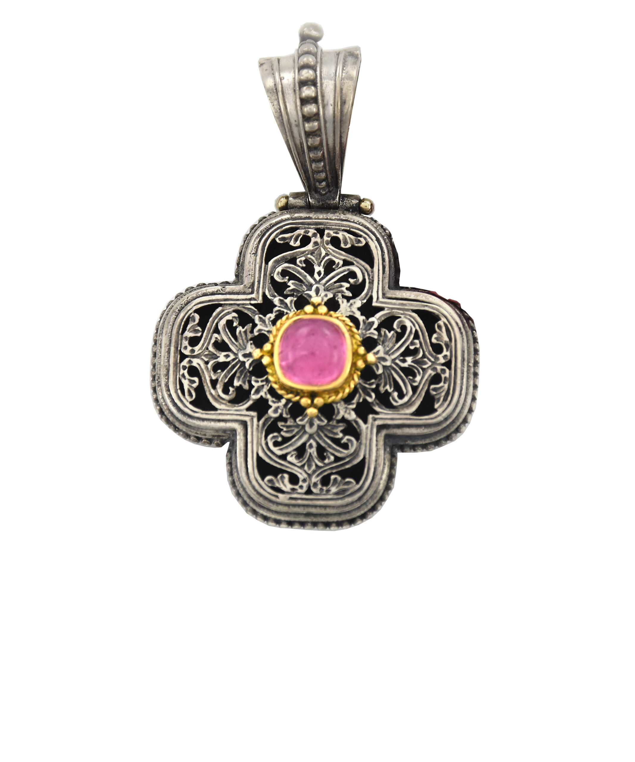 Symmetrical byzantine style cross with filigree and a cabochon pink tourmaline in the center with 18K gold double frame around it