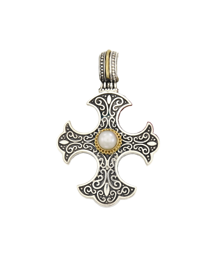 Vintage style with a pearl in the center and 18K gold frame around it and in the bail
